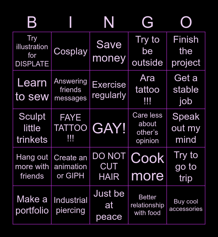 This bingo card has a free space and 24 words: Create an animation or GIPH, Industrial piercing, Exercise regularly, Make a portfolio, Finish the project, Try illustration for DISPLATE, Learn to sew, Cosplay, Care less about other’s opinion, DO NOT CUT HAIR, Ara tattoo !!!, Sculpt little trinkets, Cook more, Try to go to trip, Answering friends messages, Better relationship with food, Speak out my mind, Save money, Get a stable job, FAYE TATTOO !!!, Buy cool accessories, Hang out more with friends, Try to be outside and Just be at peace.