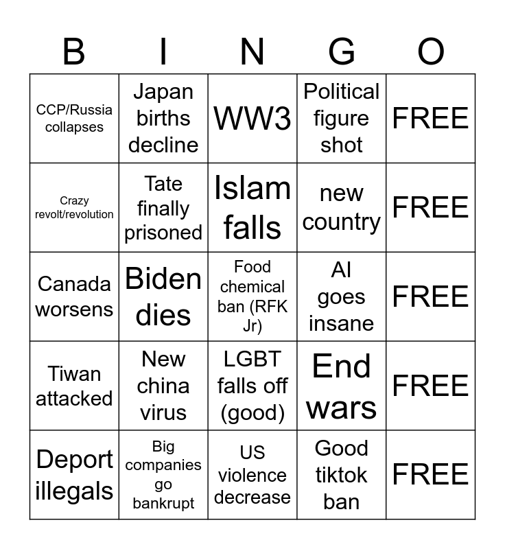 This bingo card has 25 words: Tiwan attacked, Big companies go bankrupt, Food chemical ban (RFK Jr), Good tiktok ban, FREE, CCP/Russia collapses, Japan births decline, WW3, AI goes insane, FREE, Crazy revolt/revolution, Tate finally prisoned, US violence decrease, End wars, FREE, Deport illegals, Biden dies, Islam falls, new country, FREE, Canada worsens, New china virus, LGBT falls off (good), Political figure shot and FREE.
