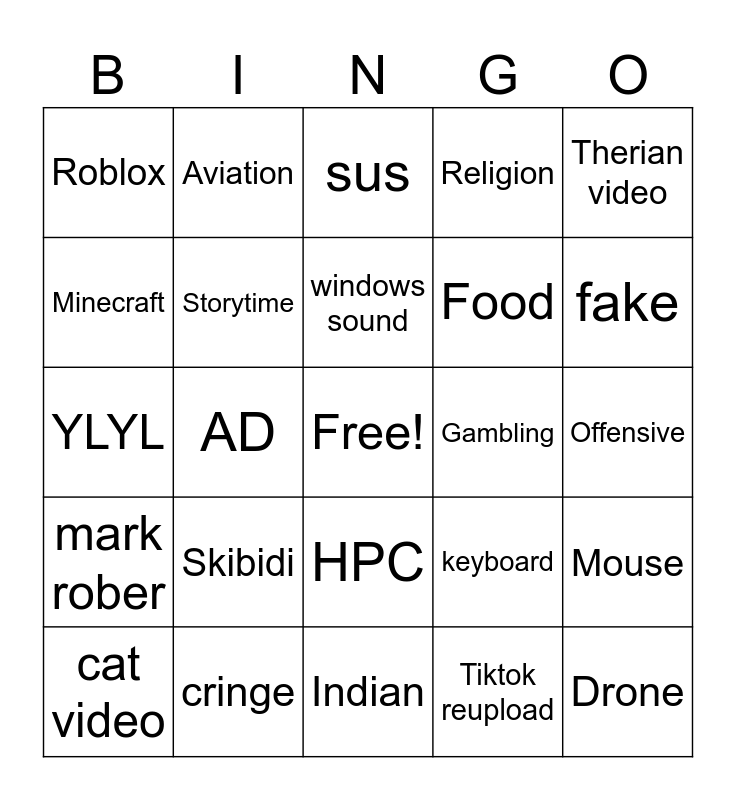 This bingo card has a free space and 24 words: Skibidi, cringe, windows sound, cat video, Therian video, Roblox, Minecraft, Aviation, Gambling, HPC, Food, YLYL, keyboard, Mouse, Storytime, Tiktok reupload, Offensive, sus, fake, AD, Drone, mark rober, Religion and Indian.