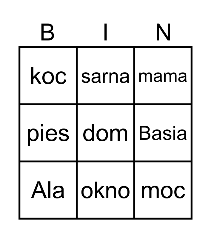 This bingo card has 9 words: Ala, dom, mama, koc, sarna, Basia, pies, okno and moc.