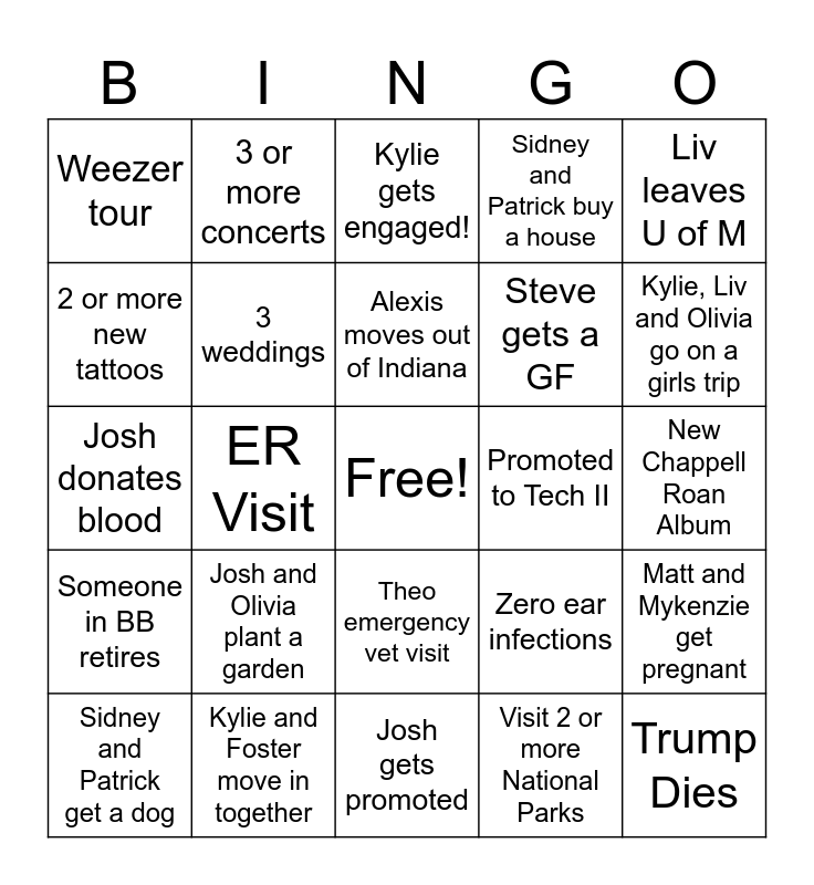 This bingo card has a free space and 24 words: Josh and Olivia plant a garden, Kylie and Foster move in together, Alexis moves out of Indiana, Sidney and Patrick get a dog, Liv leaves U of M, Weezer tour, 2 or more new tattoos, 3 or more concerts, Promoted to Tech II, Theo emergency vet visit, Steve gets a GF, Josh donates blood, Zero ear infections, Matt and Mykenzie get pregnant, 3 weddings, Visit 2 or more National Parks, New Chappell Roan Album, Kylie gets engaged!, Kylie, Liv and Olivia go on a girls trip, ER Visit, Trump Dies, Someone in BB retires, Sidney and Patrick buy a house and Josh gets promoted.