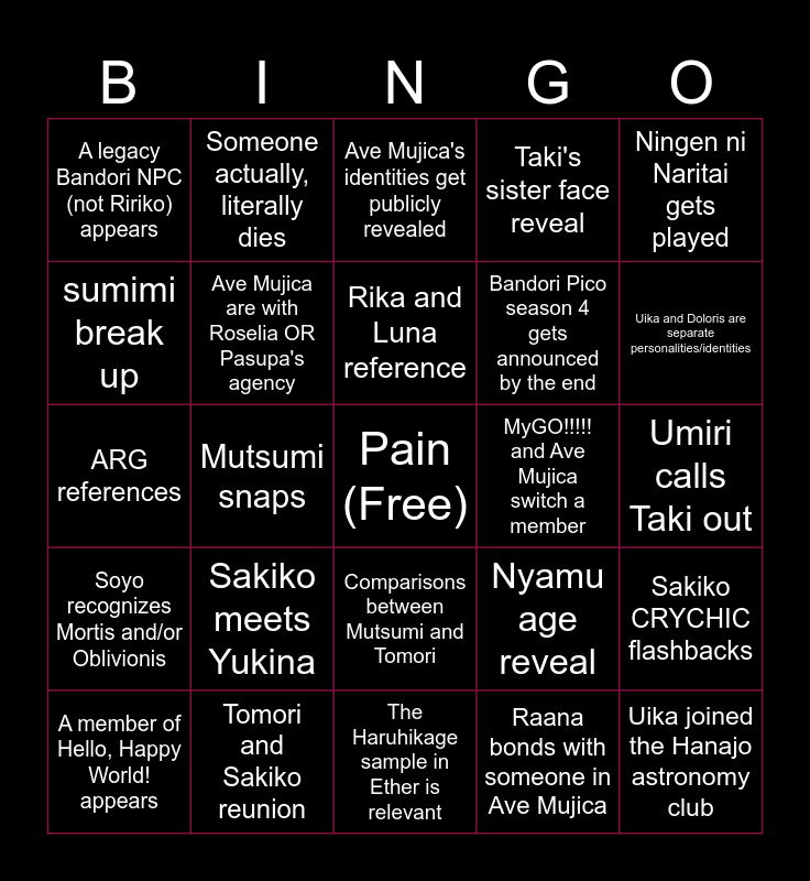 This bingo card has a free space and 24 words: Sakiko meets Yukina, Tomori and Sakiko reunion, Rika and Luna reference, A member of Hello, Happy World! appears, Ningen ni Naritai gets played, A legacy Bandori NPC (not Ririko) appears, sumimi break up, Someone actually, literally dies, MyGO!!!!! and Ave Mujica switch a member, Comparisons between Mutsumi and Tomori, Bandori Pico season 4 gets announced by the end, ARG references, Nyamu age reveal, Sakiko CRYCHIC flashbacks, Ave Mujica are with Roselia OR Pasupa's agency, Raana bonds with someone in Ave Mujica, Umiri calls Taki out, Ave Mujica's identities get publicly revealed, Uika and Doloris are separate personalities/identities, Mutsumi snaps, Uika joined the Hanajo astronomy club, Soyo recognizes Mortis and/or Oblivionis, Taki's sister face reveal and The Haruhikage sample in Ether is relevant.