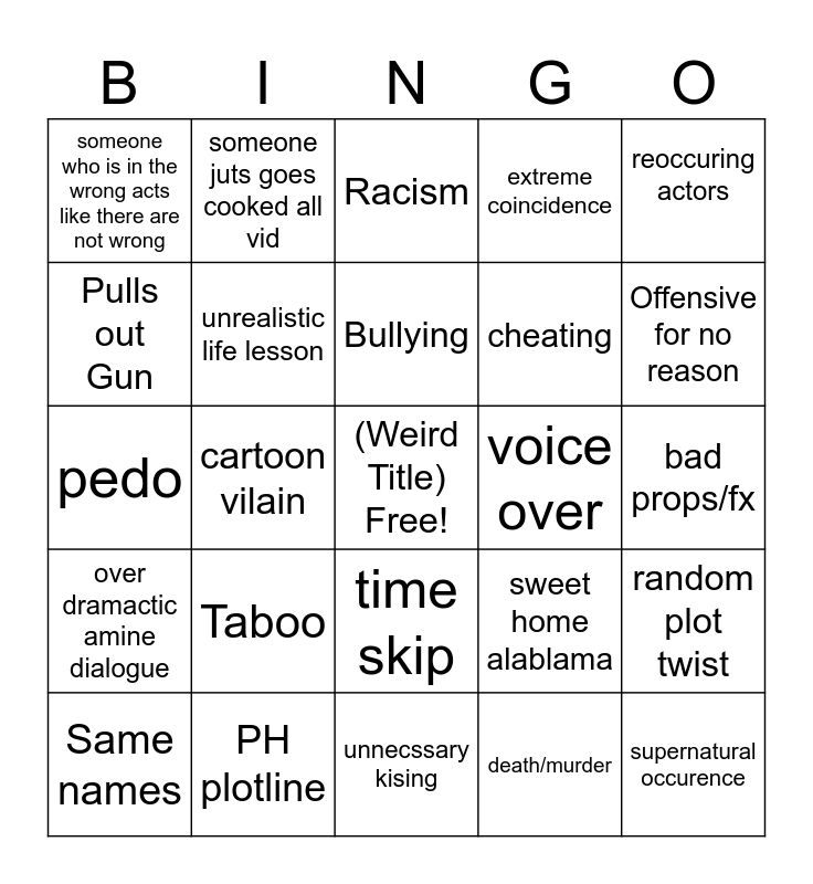 This bingo card has a free space and 24 words: Taboo, PH plotline, Bullying, Same names, reoccuring actors, someone who is in the wrong acts like there are not wrong, Pulls out Gun, someone juts goes cooked all vid, voice over, time skip, cheating, pedo, sweet home alablama, random plot twist, unrealistic life lesson, death/murder, bad props/fx, Racism, Offensive for no reason, cartoon vilain, supernatural occurence, over dramactic amine dialogue, extreme coincidence and unnecssary kising.