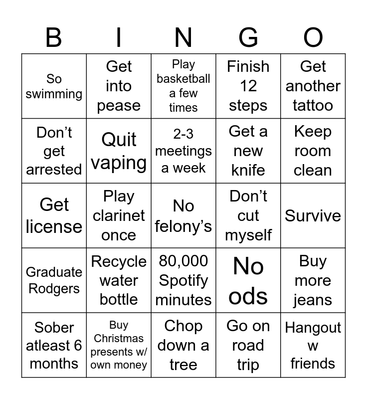 This bingo card has a free space and 24 words: Sober atleast 6 months, Recycle water bottle, 2-3 meetings a week, Go on road trip, Get another tattoo, So swimming, Get into pease, Play basketball a few times, Don’t cut myself, Survive, Get license, Quit vaping, No ods, Buy more jeans, Don’t get arrested, Buy Christmas presents w/ own money, Chop down a tree, Finish 12 steps, Keep room clean, Graduate Rodgers, Play clarinet once, 80,000 Spotify minutes, Get a new knife and Hangout w friends.