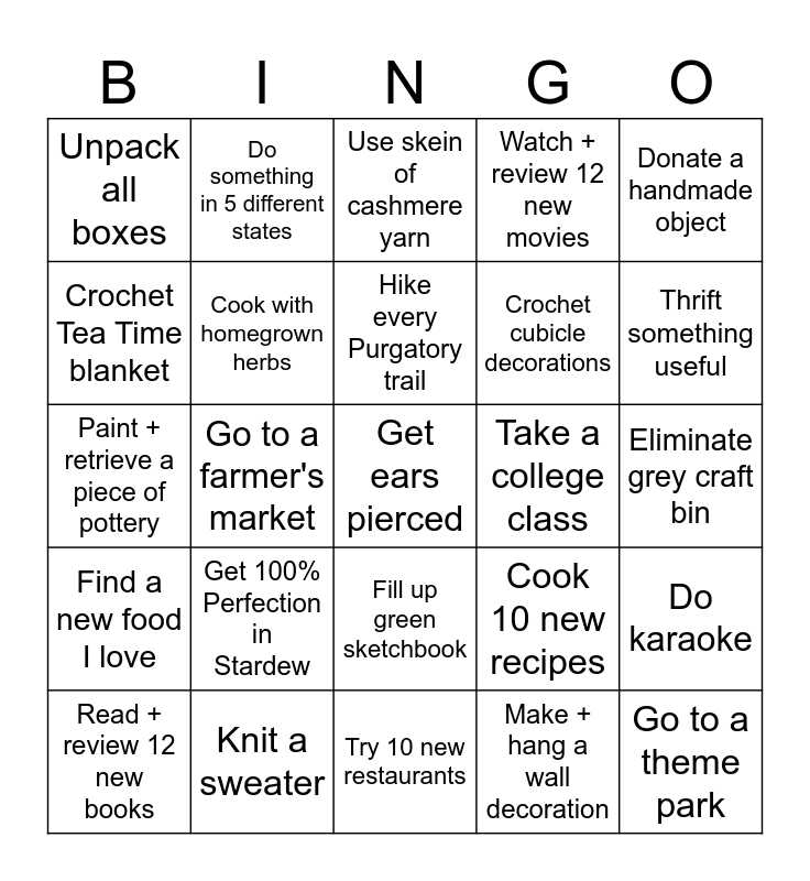 This bingo card has a free space and 24 words: Get 100% Perfection in Stardew, Knit a sweater, Hike every Purgatory trail, Read + review 12 new books, Donate a handmade object, Unpack all boxes, Crochet Tea Time blanket, Do something in 5 different states, Take a college class, Fill up green sketchbook, Crochet cubicle decorations, Paint + retrieve a piece of pottery, Cook 10 new recipes, Do karaoke, Cook with homegrown herbs, Make + hang a wall decoration, Eliminate grey craft bin, Use skein of cashmere yarn, Thrift something useful, Go to a farmer's market, Go to a theme park, Find a new food I love, Watch + review 12 new movies and Try 10 new restaurants.