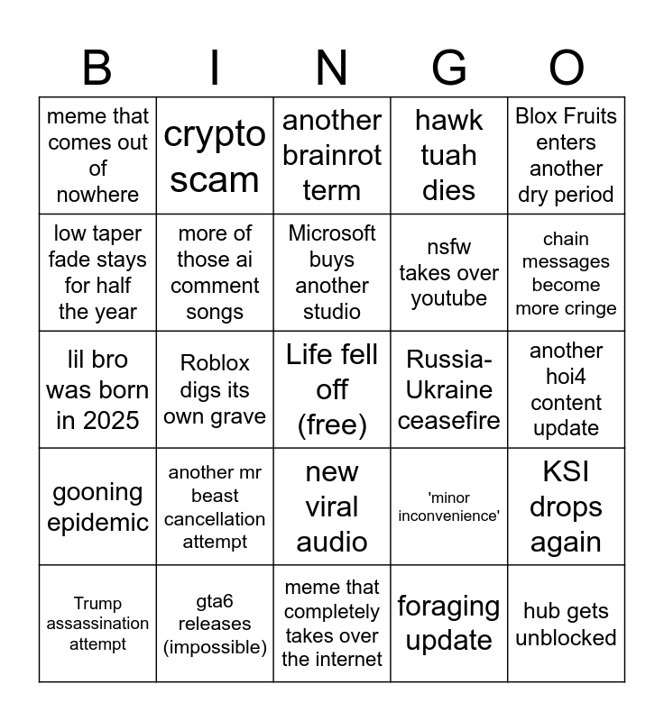 This bingo card has a free space and 24 words: another mr beast cancellation attempt, gta6 releases (impossible), Microsoft buys another studio, Trump assassination attempt, Blox Fruits enters another dry period, meme that comes out of nowhere, low taper fade stays for half the year, crypto scam, Russia-Ukraine ceasefire, new viral audio, nsfw takes over youtube, lil bro was born in 2025, 'minor inconvenience', KSI drops again, more of those ai comment songs, foraging update, another hoi4 content update, another brainrot term, chain messages become more cringe, Roblox digs its own grave, hub gets unblocked, gooning epidemic, hawk tuah dies and meme that completely takes over the internet.