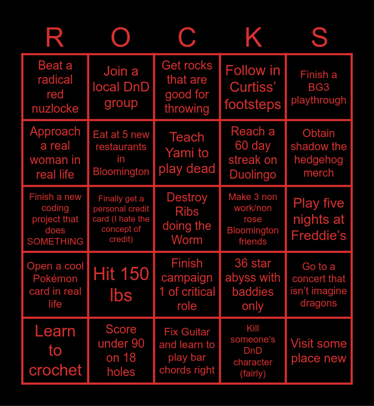 This bingo card has a free space and 24 words: Hit 150 lbs, Score under 90 on 18 holes, Teach Yami to play dead, Learn to crochet, Finish a BG3 playthrough, Beat a radical red nuzlocke, Approach a real woman in real life, Join a local DnD group, Make 3 non work/non rose Bloomington friends, Finish campaign 1 of critical role, Reach a 60 day streak on Duolingo, Finish a new coding project that does SOMETHING, 36 star abyss with baddies only, Go to a concert that isn’t imagine dragons, Eat at 5 new restaurants in Bloomington, Kill someone’s DnD character (fairly), Play five nights at Freddie’s, Get rocks that are good for throwing, Obtain shadow the hedgehog merch, Finally get a personal credit card (I hate the concept of credit), Visit some place new, Open a cool Pokémon card in real life, Follow in Curtiss’ footsteps and Fix Guitar and learn to play bar chords right.