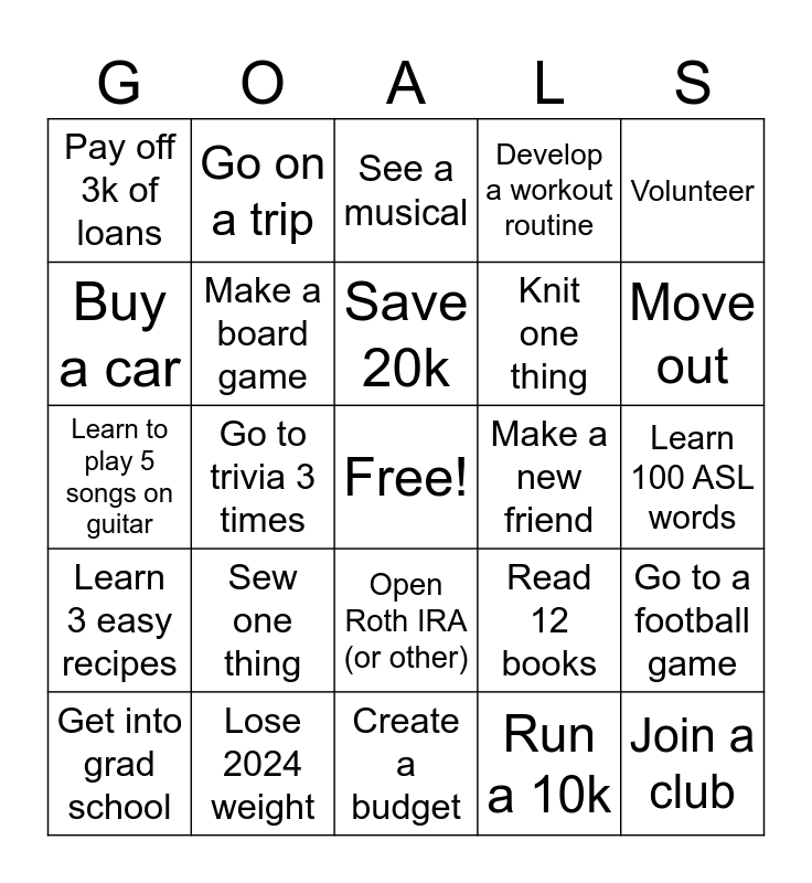 This bingo card has a free space and 24 words: Sew one thing, Lose 2024 weight, Save 20k, Get into grad school, Volunteer, Pay off 3k of loans, Buy a car, Go on a trip, Make a new friend, Open Roth IRA (or other), Knit one thing, Learn to play 5 songs on guitar, Read 12 books, Go to a football game, Make a board game, Run a 10k, Learn 100 ASL words, See a musical, Move out, Go to trivia 3 times, Join a club, Learn 3 easy recipes, Develop a workout routine and Create a budget.