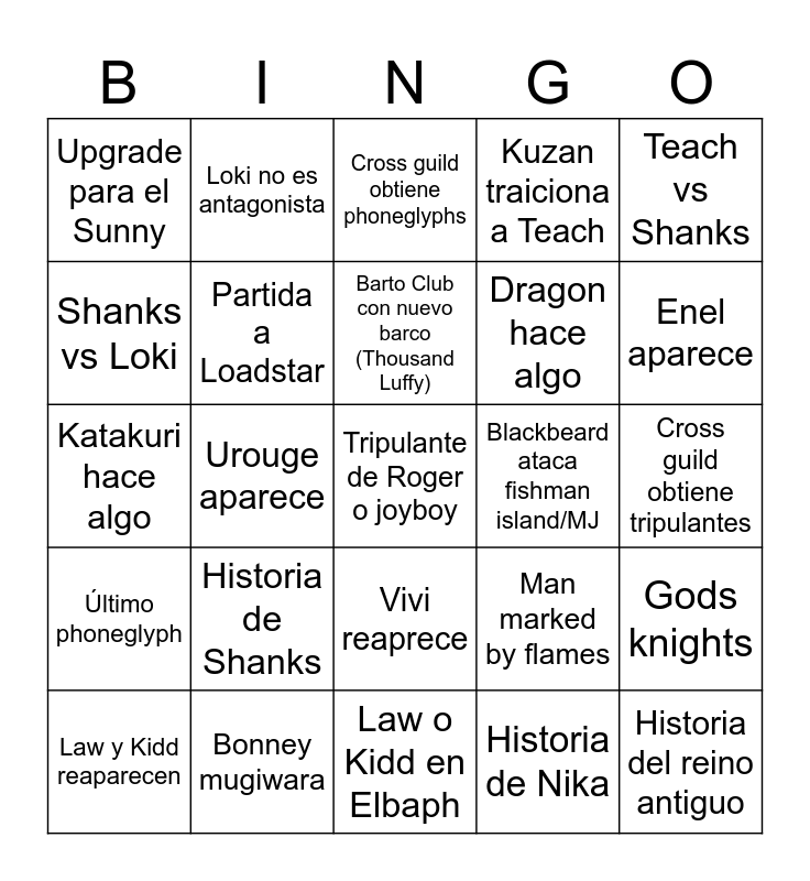 This bingo card has a free space and 24 words: Historia de Shanks, Bonney mugiwara, Barto Club con nuevo barco (Thousand Luffy), Law y Kidd reaparecen, Teach vs Shanks, Upgrade para el Sunny, Shanks vs Loki, Loki no es antagonista, Blackbeard ataca fishman island/MJ, Vivi reaprece, Dragon hace algo, Katakuri hace algo, Man marked by flames, Gods knights, Partida a Loadstar, Historia de Nika, Cross guild obtiene tripulantes, Cross guild obtiene phoneglyphs, Enel aparece, Urouge aparece, Historia del reino antiguo, Último phoneglyph, Kuzan traiciona a Teach and Law o Kidd en Elbaph.