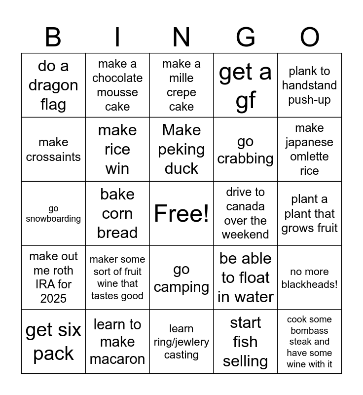This bingo card has a free space and 24 words: maker some sort of fruit wine that tastes good, learn to make macaron, Make peking duck, get six pack, plank to handstand push-up, do a dragon flag, make crossaints, make a chocolate mousse cake, drive to canada over the weekend, go camping, go crabbing, go snowboarding, be able to float in water, no more blackheads!, make rice win, start fish selling, plant a plant that grows fruit, make a mille crepe cake, make japanese omlette rice, bake corn bread, cook some bombass steak and have some wine with it, make out me roth IRA for 2025, get a gf and learn ring/jewlery casting.