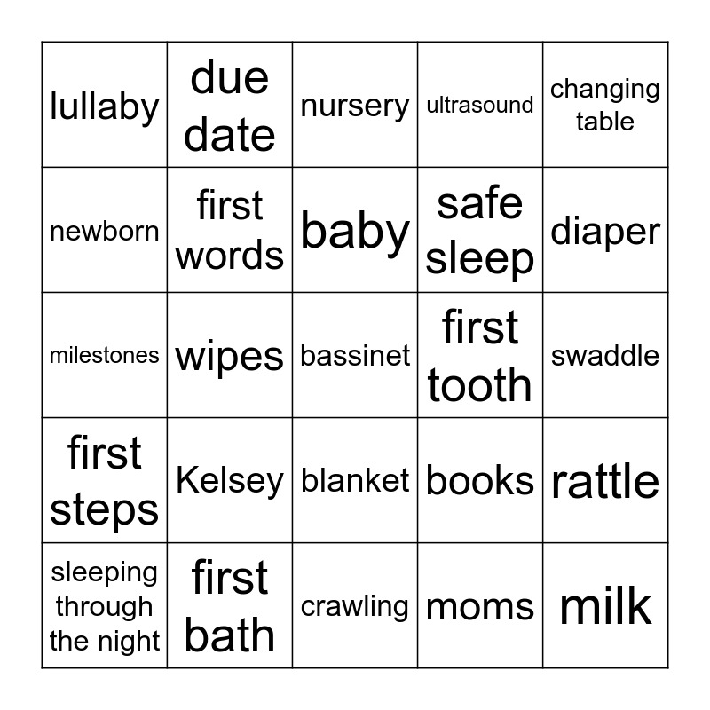 This bingo card has 42 words: Elodie, baby, Jen, Kelsey, moms, rattle, bassinet, crib, nursery, blanket, swaddle, diaper, wipes, changing table, rocking chair, books, toys, milestones, joy, due date, newborn, bottle, milk, lullaby, stroller, car seat, safe sleep, tummy time, swing, shoes, onesie, first steps, first words, crawling, teething, sleeping through the night, first bath, first tooth, first food, diaper bag, ultrasound and high chair.
