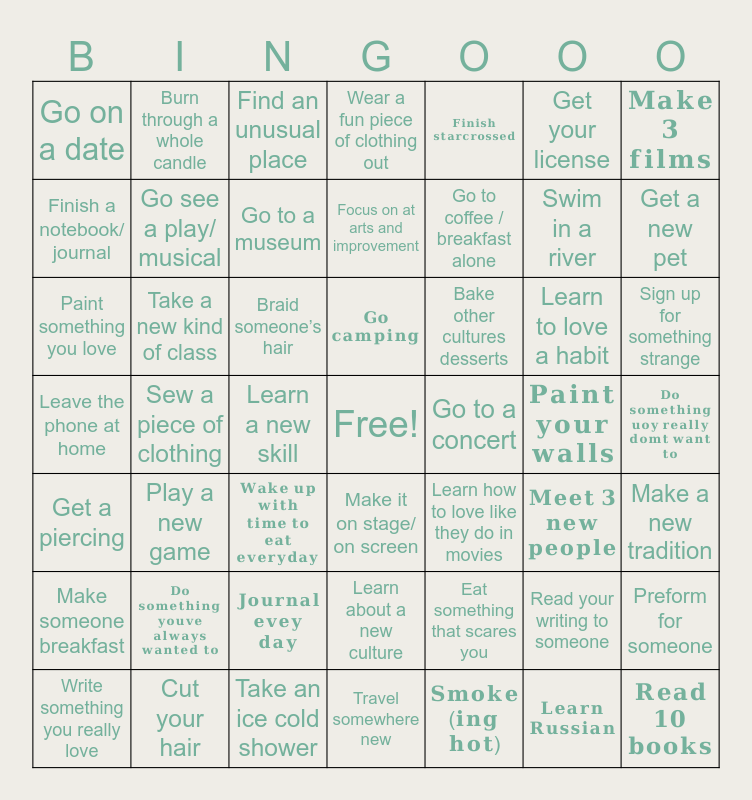 This bingo card has a free space and 48 words: Eat something that scares you, Swim in a river, Travel somewhere new, Sew a piece of clothing, Braid someoneโs hair, ๐๐จ ๐ฌ๐จ๐ฆ๐๐ญ๐ก๐ข๐ง๐ ๐ฎ๐จ๐ฒ ๐ซ๐๐๐ฅ๐ฅ๐ฒ ๐๐จ๐ฆ๐ญ ๐ฐ๐๐ง๐ญ ๐ญ๐จ, Burn through a whole candle, Cut your hair, Get your license, Make it on stage/ on screen, ๐๐๐ค๐ ๐ ๐๐ข๐ฅ๐ฆ๐ฌ, Wear a fun piece of clothing out, Learn to love a habit, Bake other cultures desserts, Make someone breakfast, ๐๐๐ข๐ง๐ญ ๐ฒ๐จ๐ฎ๐ซ ๐ฐ๐๐ฅ๐ฅ๐ฌ, Finish a notebook/ journal, Get a new pet, Read your writing to someone, ๐ ๐ข๐ง๐ข๐ฌ๐ก ๐ฌ๐ญ๐๐ซ๐๐ซ๐จ๐ฌ๐ฌ๐๐, Go to coffee / breakfast alone, Learn a new skill, Go on a date, Go see a play/ musical, Preform for someone, Go to a museum, Sign up for something strange, Write something you really love, ๐๐จ ๐๐๐ฆ๐ฉ๐ข๐ง๐ , Take a new kind of class, ๐๐๐๐ซ๐ง ๐๐ฎ๐ฌ๐ฌ๐ข๐๐ง, Go to a concert, Make a new tradition, ๐๐จ ๐ฌ๐จ๐ฆ๐๐ญ๐ก๐ข๐ง๐ ๐ฒ๐จ๐ฎ๐ฏ๐ ๐๐ฅ๐ฐ๐๐ฒ๐ฌ ๐ฐ๐๐ง๐ญ๐๐ ๐ญ๐จ, Leave the phone at home, Learn how to love like they do in movies, ๐๐๐๐ญ ๐ ๐ง๐๐ฐ ๐ฉ๐๐จ๐ฉ๐ฅ๐, Paint something you love, ๐๐๐ค๐ ๐ฎ๐ฉ ๐ฐ๐ข๐ญ๐ก ๐ญ๐ข๐ฆ๐ ๐ญ๐จ ๐๐๐ญ ๐๐ฏ๐๐ซ๐ฒ๐๐๐ฒ, ๐๐จ๐ฎ๐ซ๐ง๐๐ฅ ๐๐ฏ๐๐ฒ ๐๐๐ฒ, Get a piercing, ๐๐๐๐ ๐๐ ๐๐จ๐จ๐ค๐ฌ, Find an unusual place, Take an ice cold shower, Focus on at arts and improvement, Learn about a new culture, Play a new game and ๐๐ฆ๐จ๐ค๐ (๐ข๐ง๐ ๐ก๐จ๐ญ).