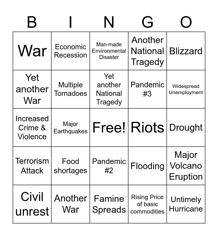 This bingo card has a free space and 29 words: Civil unrest, Famine, Major Earthquakes, Plague, War, Man-made Environmental Disaster, Multiple Tornadoes, Food shortages, Riots, Another War, Drought, Untimely Hurricane, Famine Spreads, Rising Price of basic commodities, Widespread Unemployment, Civil War, Pandemic #2, Terrorism Attack, Blizzard, Increased Crime & Violence, Flooding, National Tragedy, Pandemic #3, Yet another War, Another National Tragedy, Economic Recession, Major Volcano Eruption, Yet another National Tragedy and Extreme Wildfires.