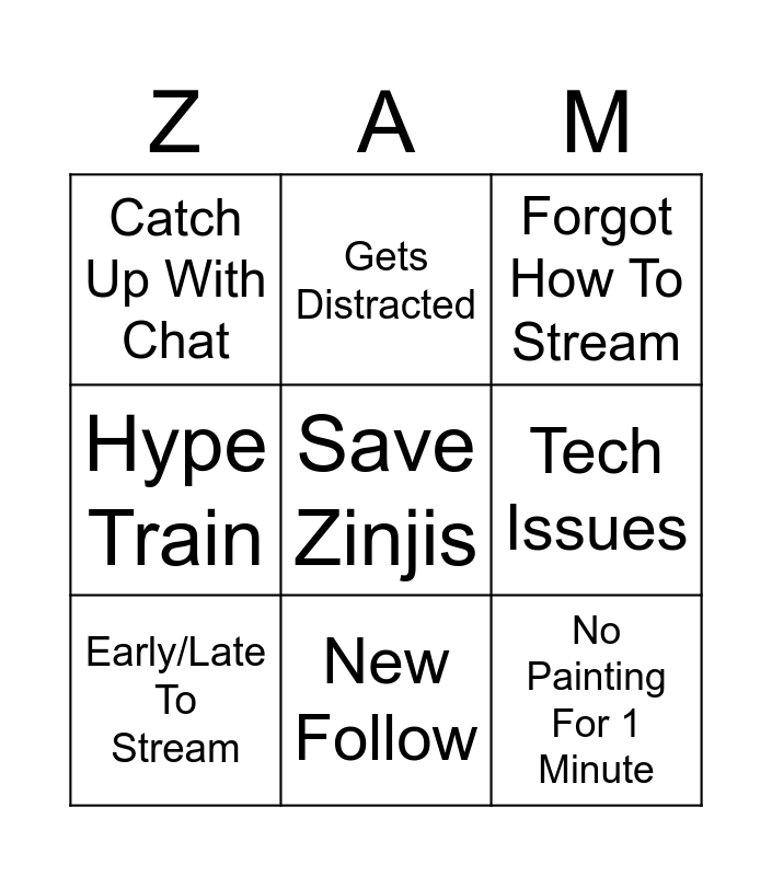 This bingo card has a free space and 8 words: Tech Issues, Forgot How To Stream, Gets Distracted, Early/Late To Stream, Catch Up With Chat, No Painting For 1 Minute, Hype Train and New Follow.