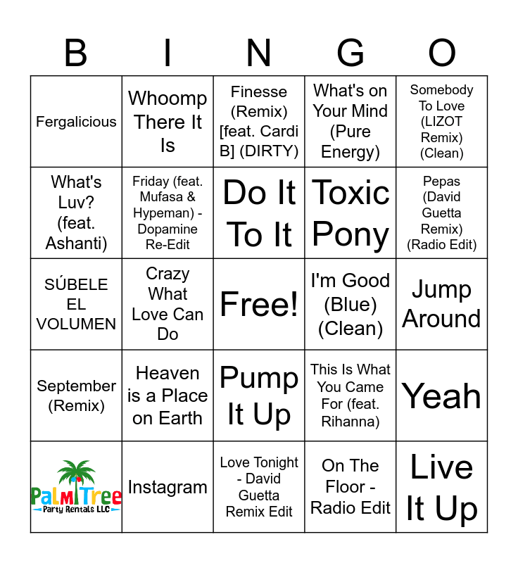 This bingo card has 1 images, a free space and 28 words: BREAK MY SOUL, Crazy What Love Can Do, Fancy Like (Dave Audé Remix), Fergalicious, Finesse (Remix) [feat. Cardi B] (DIRTY), Friday (feat. Mufasa & Hypeman) - Dopamine Re-Edit, Heaven is a Place on Earth, I'm Good (Blue) (Clean), Instagram, Jump Around, Live It Up, Love Tonight - David Guetta Remix Edit, On The Floor - Radio Edit, Pepas (David Guetta Remix) (Radio Edit), Permitame, Pump It Up, September (Remix), Somebody To Love (LIZOT Remix) (Clean), SÚBELE EL VOLUMEN, This Is What You Came For (feat. Rihanna), Tip Toe (feat. French Montana), Toxic Pony, What's Luv? (feat. Ashanti), What's on Your Mind (Pure Energy), Whoomp There It Is, Yeah, Do It To It and Lil Bit (FGL Remix).