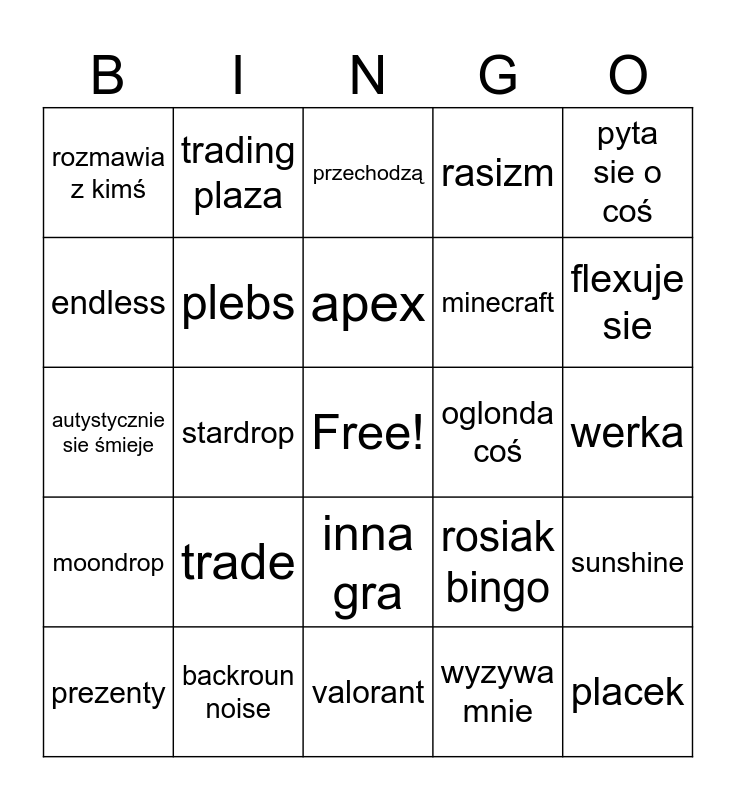 This bingo card has a free space and 24 words: trade, backroun noise, apex, prezenty, pyta sie o coś, rozmawia z kimś, endless, trading plaza, oglonda coś, inna gra, minecraft, autystycznie sie śmieje, rosiak bingo, sunshine, plebs, wyzywa mnie, werka, przechodzą, flexuje sie, stardrop, placek, moondrop, rasizm and valorant.