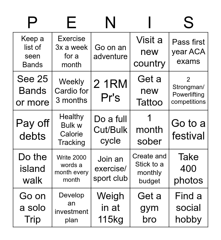 This bingo card has 25 words: Write 2000 words a month every month, Weigh in at 115kg, 2 1RM Pr's, Go on a solo Trip, Pass first year ACA exams, Keep a list of seen Bands, See 25 Bands or more, Exercise 3x a week for a month, 1 month sober, Join an exercise/ sport club, Get a new Tattoo, Pay off debts, Create and Stick to a monthly budget, Take 400 photos, Weekly Cardio for 3 months, Find a social hobby, Go to a festival, Go on an adventure, 2 Strongman/ Powerlifting competitions, Healthy Bulk w Calorie Tracking, Do a full Cut/Bulk cycle, Develop an investment plan, Do the island walk, Visit a new country and Get a gym bro.