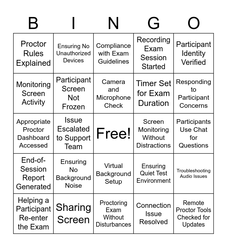 This bingo card has a free space and 26 words: Virtual Background Setup, Connection Issue Resolved, Camera and Microphone Check, Sharing Screen, Participant Identity Verified, Proctor Rules Explained, Monitoring Screen Activity, Ensuring No Unauthorized Devices, Participants Use Chat for Questions, Ensuring Quiet Test Environment, Timer Set for Exam Duration, Appropriate Proctor Dashboard Accessed, Troubleshooting Audio Issues, Helping a Participant Re-enter the Exam, Issue Escalated to Support Team, Ensuring Exam Content Integrity, Recording Exam Session Started, End-of-Session Report Generated, Compliance with Exam Guidelines, Remote Proctor Tools Checked for Updates, Responding to Participant Concerns, Proctoring Exam Without Disturbances, Screen Monitoring Without Distractions, Ensuring No Background Noise, Participant Screen Not Frozen and Successful Exam Completion Confirmation.
