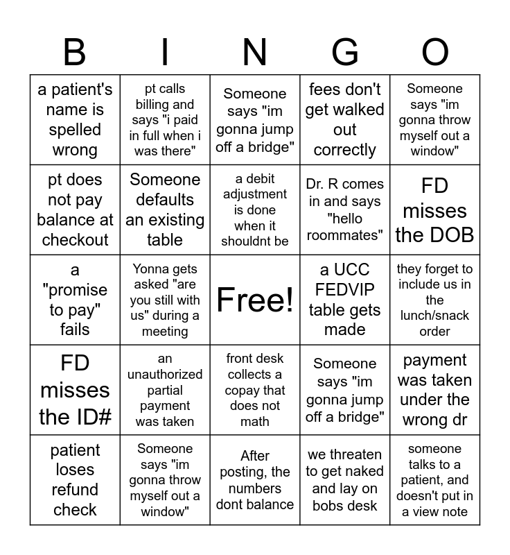 This bingo card has a free space and 24 words: patient loses refund check, an unauthorized partial payment was taken, a debit adjustment is done when it shouldnt be, we threaten to get naked and lay on bobs desk, Someone says "im gonna throw myself out a window", a patient's name is spelled wrong, pt calls billing and says "i paid in full when i was there", Someone says "im gonna jump off a bridge", a UCC FEDVIP table gets made, they forget to include us in the lunch/snack order, a "promise to pay" fails, Someone defaults an existing table, Someone says "im gonna jump off a bridge", payment was taken under the wrong dr, pt does not pay balance at checkout, Someone says "im gonna throw myself out a window", After posting, the numbers dont balance, fees don't get walked out correctly, FD misses the DOB, FD misses the ID#, Yonna gets asked "are you still with us" during a meeting, front desk collects a copay that does not math, Dr. R comes in and says "hello roommates" and someone talks to a patient, and doesn't put in a view note.