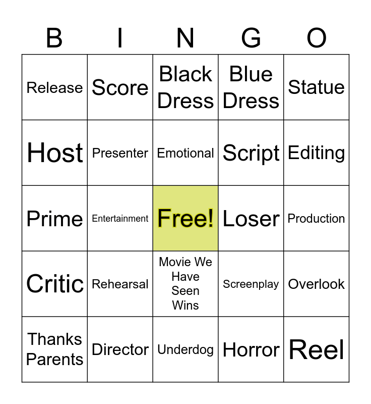 This bingo card has a free space and 116 words: Winner Cries, Yellow Dress, Person Has Won Before, Red Dress, Odd Tux/Suit, First Time Winner, Blue Dress, White Dress, Speech On Cards, No Written Speech, "Kids At Home", Political Message, Thank Wife/ Husband, "Wicked" Wins, "Emilia Perez" wins, Show We Watch Wins, Movie We Have Seen Wins, Something Bleeped/Cut, Mentions Award Weight, Played Off, Thanks Parents, Black Dress, Foreign Language Spoken, Puts On Glasses, Costume, Critic, Director, Disney +, Documentary, Drama, Editing, Emotional, Entertainment, Envelope, Famous, Fans, Fashion, Film, Flick, Foreign, Genre, Golden Globes, Gowns, Grip, Hairstylist, Hollywood, Horror, Host, Jokes, Judge, Lighting, Loser, Makeup, Miniseries, Motion Picture, Movies, Musical, Netflix, Nomination, Outtake, Overlook, Performance, Picture, Podium, Portrayal, Prediction, Premiere, Presenter, Prime, Producer, Production, Ratings, Recipient, Recognition, Red Carpet, Reel, Rehearsal, Release, Role, Romantic, Scene, Score, Screen, Screenplay, Script, Seats, Sequel, Sound Effect, Soundtrack, Special Effect, Speech, Spotlight, Stage, Star, Statue, Studio, Stunt Man, Subtitle, Supporting, Talent, Television, Theatre, Theme, Thriller, Tickets, Tribute, Triumph, Tuxedo, Underdog, Venue, Victory, Visual Effects, Voice Over, Wardrobe, Winner and Writer.