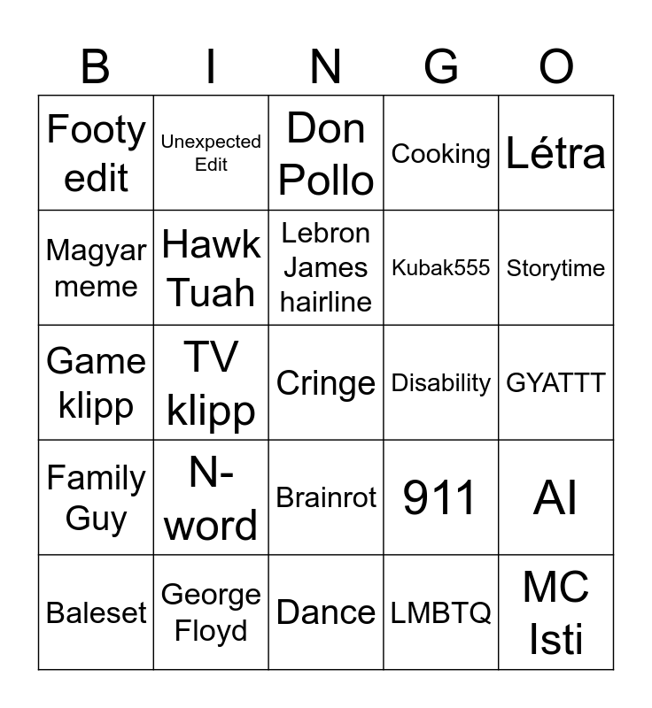 This bingo card has a free space and 24 words: N-word, George Floyd, Lebron James hairline, Baleset, Létra, Footy edit, Magyar meme, Unexpected Edit, Disability, Brainrot, Kubak555, Game klipp, 911, AI, Hawk Tuah, LMBTQ, GYATTT, Don Pollo, Storytime, TV klipp, MC Isti, Family Guy, Cooking and Dance.