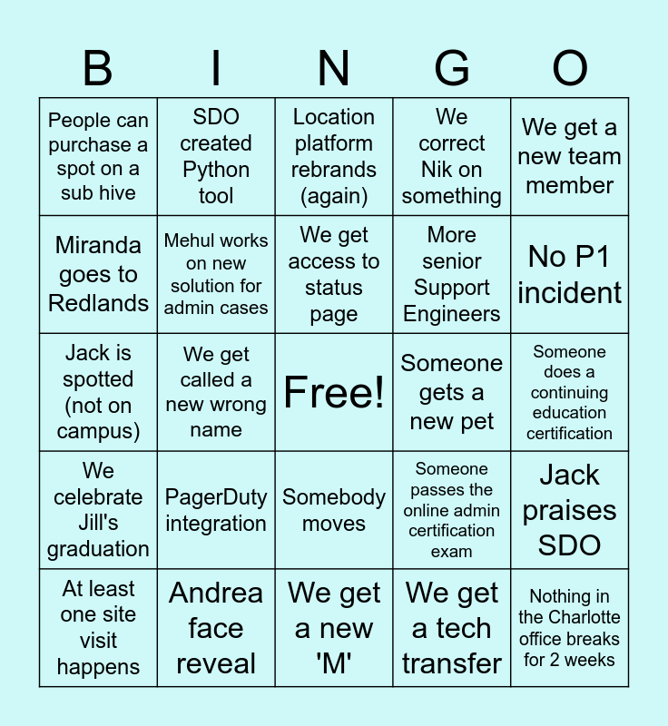 This bingo card has a free space and 24 words: PagerDuty integration, Andrea face reveal, We get access to status page, At least one site visit happens, We get a new team member, People can purchase a spot on a sub hive, Miranda goes to Redlands, SDO created Python tool, Someone gets a new pet, Somebody moves, More senior Support Engineers, Jack is spotted (not on campus), Someone passes the online admin certification exam, Jack praises SDO, Mehul works on new solution for admin cases, We get a tech transfer, Someone does a continuing education certification, Location platform rebrands (again), No P1 incident, We get called a new wrong name, Nothing in the Charlotte office breaks for 2 weeks, We celebrate Jill's graduation, We correct Nik on something and We get a new 'M'.