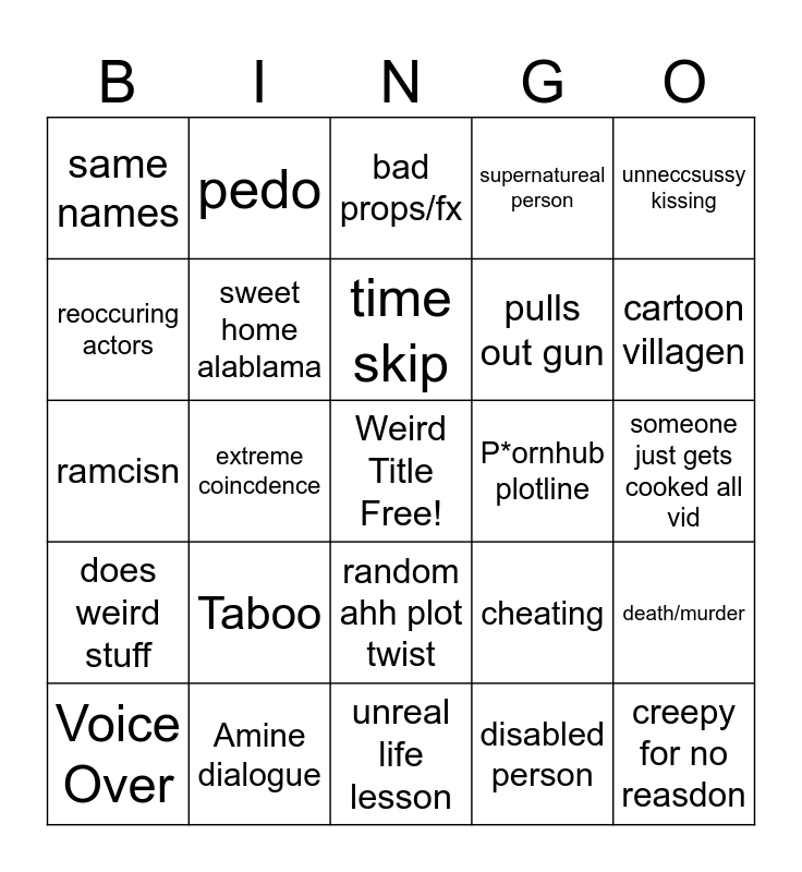 This bingo card has a free space and 24 words: Taboo, Amine dialogue, time skip, Voice Over, unneccsussy kissing, same names, reoccuring actors, pedo, P*ornhub plotline, random ahh plot twist, pulls out gun, ramcisn, cheating, death/murder, sweet home alablama, disabled person, someone just gets cooked all vid, bad props/fx, cartoon villagen, extreme coincdence, creepy for no reasdon, does weird stuff, supernatureal person and unreal life lesson.