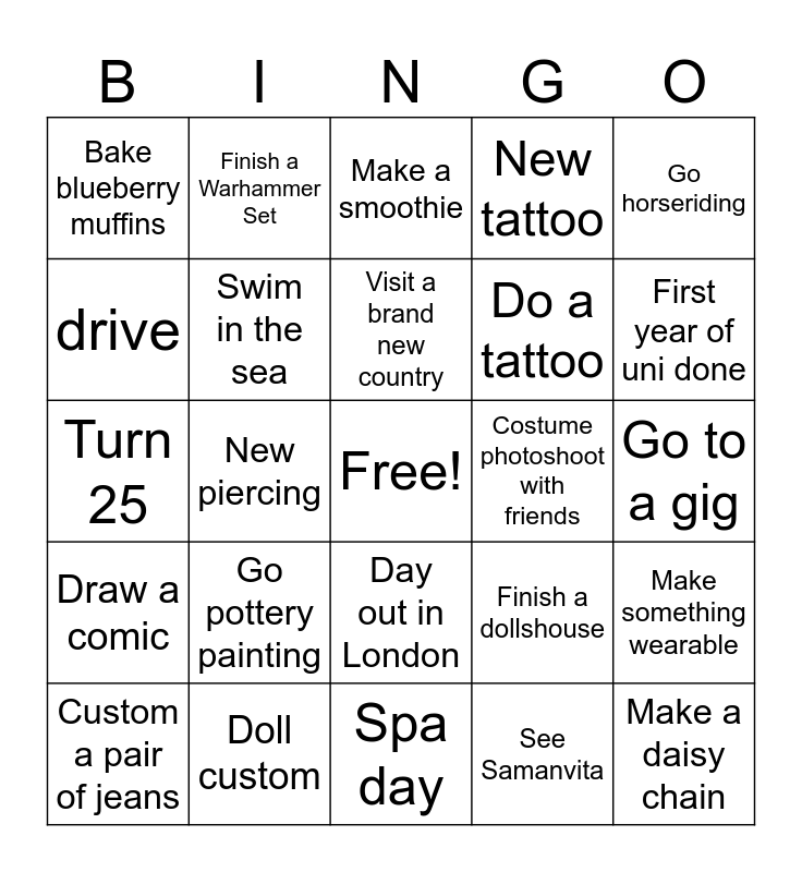 This bingo card has a free space and 24 words: Go pottery painting, Doll custom, Visit a brand new country, Custom a pair of jeans, Go horseriding, Bake blueberry muffins, drive, Finish a Warhammer Set, Costume photoshoot with friends, Day out in London, Do a tattoo, Turn 25, Finish a dollshouse, Make something wearable, Swim in the sea, See Samanvita, Go to a gig, Make a smoothie, First year of uni done, New piercing, Make a daisy chain, Draw a comic, New tattoo and Spa day.