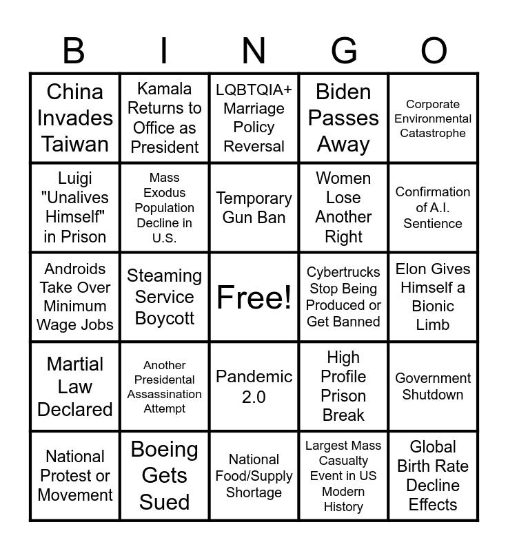 This bingo card has a free space and 24 words: Another Presidental Assassination Attempt, Boeing Gets Sued, Temporary Gun Ban, National Protest or Movement, Corporate Environmental Catastrophe, China Invades Taiwan, Luigi "Unalives Himself" in Prison, Kamala Returns to Office as President, Cybertrucks Stop Being Produced or Get Banned, Pandemic 2.0, Women Lose Another Right, Androids Take Over Minimum Wage Jobs, High Profile Prison Break, Government Shutdown, Mass Exodus Population Decline in U.S., Largest Mass Casualty Event in US Modern History, Elon Gives Himself a Bionic Limb, LQBTQIA+ Marriage Policy Reversal, Confirmation of A.I. Sentience, Steaming Service Boycott, Global Birth Rate Decline Effects, Martial Law Declared, Biden Passes Away and National Food/Supply Shortage.