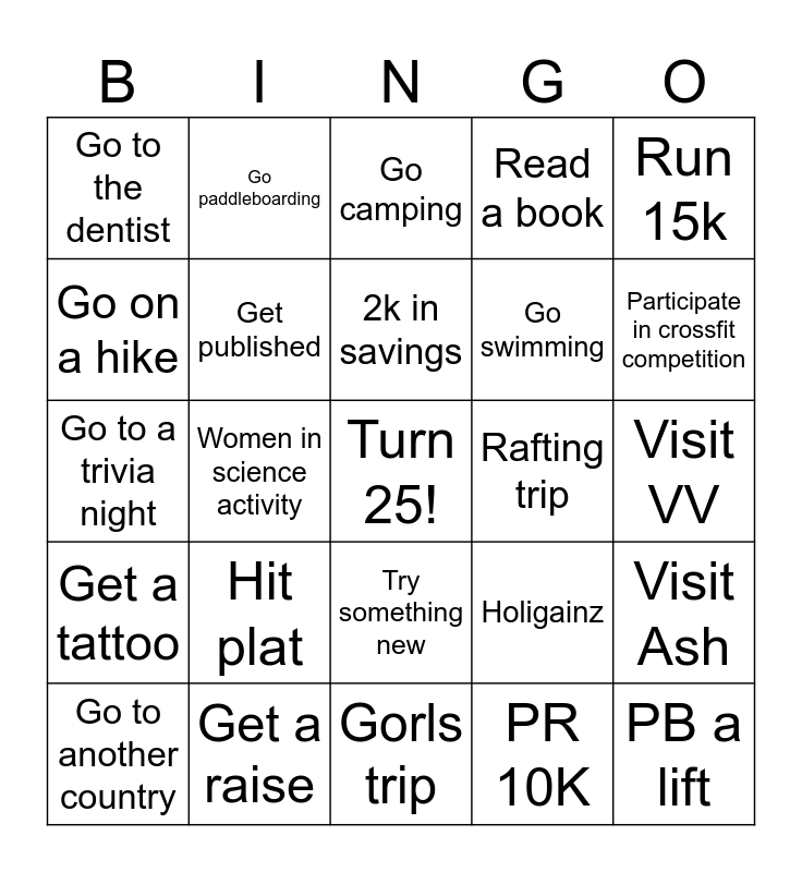 This bingo card has a free space and 24 words: Hit plat, Get a raise, 2k in savings, Go to another country, Run 15k, Go to the dentist, Go on a hike, Go paddleboarding, Rafting trip, Try something new, Go swimming, Go to a trivia night, Holigainz, Visit Ash, Get published, PR 10K, Visit VV, Go camping, Participate in crossfit competition, Women in science activity, PB a lift, Get a tattoo, Read a book and Gorls trip.