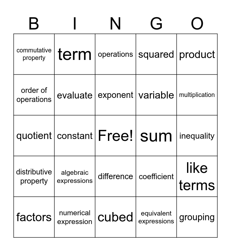 This bingo card has a free space and 24 words: algebraic expressions, numerical expression, exponent, factors, product, commutative property, order of operations, term, sum, difference, variable, quotient, coefficient, like terms, evaluate, equivalent expressions, inequality, operations, multiplication, constant, grouping, distributive property, squared and cubed.
