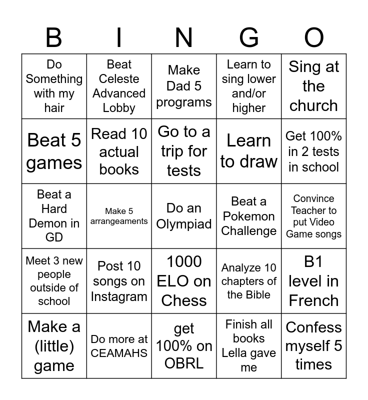 This bingo card has a free space and 24 words: Post 10 songs on Instagram, Do more at CEAMAHS, Go to a trip for tests, Make a (little) game, Sing at the church, Do Something with my hair, Beat 5 games, Beat Celeste Advanced Lobby, Beat a Pokemon Challenge, 1000 ELO on Chess, Learn to draw, Beat a Hard Demon in GD, Analyze 10 chapters of the Bible, B1 level in French, Read 10 actual books, Finish all books Lella gave me, Convince Teacher to put Video Game songs, Make Dad 5 programs, Get 100% in 2 tests in school, Make 5 arrangeaments, Confess myself 5 times, Meet 3 new people outside of school, Learn to sing lower and/or higher and get 100% on OBRL.