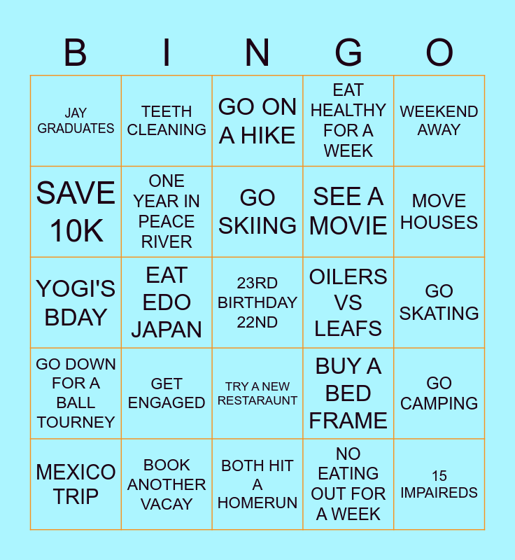 This bingo card has a free space and 24 words: MEXICO TRIP, GET ENGAGED, GO SKIING, NO EATING OUT FOR A WEEK, WEEKEND AWAY, JAY GRADUATES, TEETH CLEANING, GO ON A HIKE, OILERS VS LEAFS, GO SKATING, YOGI'S BDAY, ONE YEAR IN PEACE RIVER, BUY A BED FRAME, GO CAMPING, SAVE 10K, BOOK ANOTHER VACAY, BOTH HIT A HOMERUN, EAT HEALTHY FOR A WEEK, MOVE HOUSES, GO DOWN FOR A BALL TOURNEY, EAT EDO JAPAN, TRY A NEW RESTARAUNT, SEE A MOVIE and 15 IMPAIREDS.