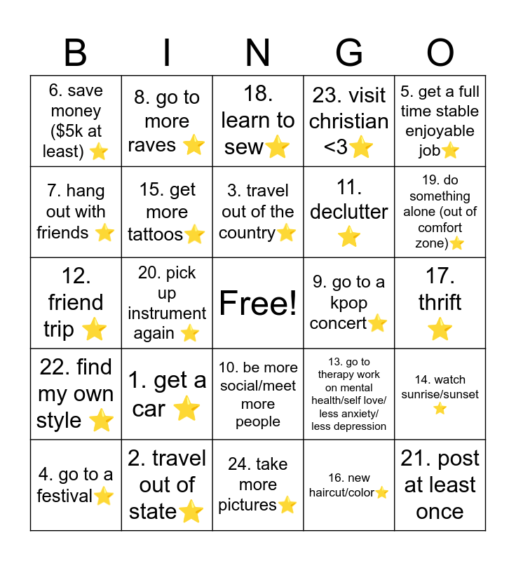 This bingo card has a free space and 24 words: 1. get a car ⭐️, 2. travel out of state⭐️, 3. travel out of the country⭐️, 4. go to a festival⭐️, 5. get a full time stable enjoyable job⭐️, 6. save money ($5k at least) ⭐️, 7. hang out with friends ⭐️, 8. go to more raves ⭐️, 9. go to a kpop concert⭐️, 10. be more social/meet more people, 11. declutter ⭐️, 12. friend trip ⭐️, 13. go to therapy work on mental health/self love/ less anxiety/ less depression, 14. watch sunrise/sunset ⭐️, 15. get more tattoos⭐️, 16. new haircut/color⭐️, 17. thrift ⭐️, 18. learn to sew⭐️, 19. do something alone (out of comfort zone)⭐️, 20. pick up instrument again ⭐️, 21. post at least once, 22. find my own style ⭐️, 23. visit christian <3⭐️ and 24. take more pictures⭐️.