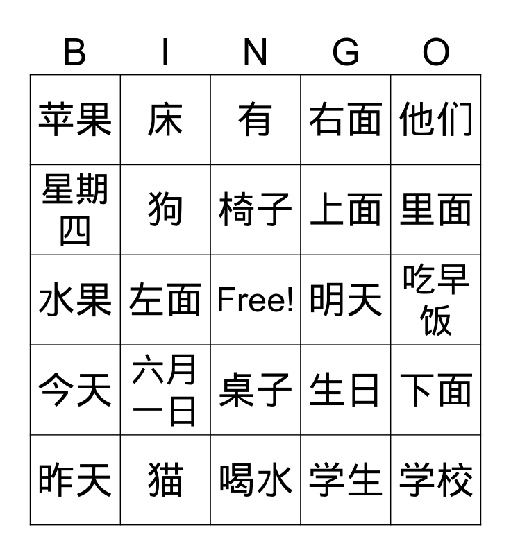 This bingo card has a free space and 26 words: 桌子, 学生, 椅子, 猫, 他们, 苹果, 星期四, 床, 吃早饭, 生日, 上面, 水果, 下面, 昨天, 左面, 九月, 右面, 今天, 有, 学校, 里面, 喝水, 明天, 六月一日, 狗 and 四十.