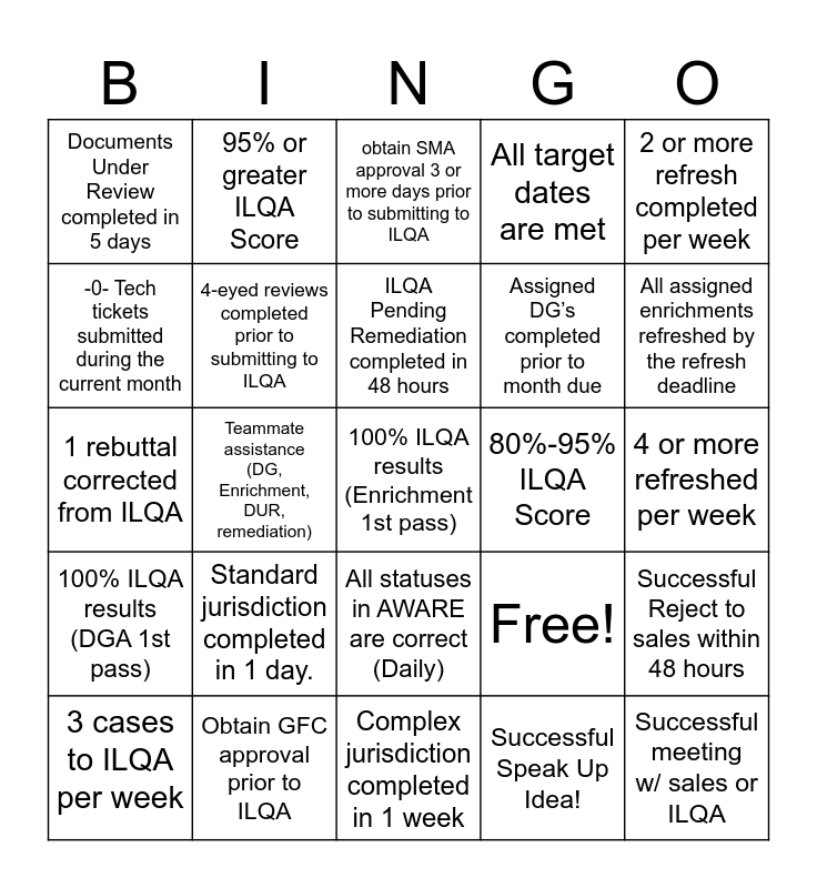 This bingo card has 25 words: Standard jurisdiction completed in 1 day., Complex jurisdiction completed in 1 week, ILQA Pending Remediation completed in 48 hours, 3 cases to ILQA per week, 2 or more refresh completed per week, Documents Under Review completed in 5 days, -0- Tech tickets submitted during the current month, 95% or greater ILQA Score, 80%-95% ILQA Score, All statuses in AWARE are correct (Daily), Assigned DG’s completed prior to month due, 1 rebuttal corrected from ILQA, Free!, Successful Reject to sales within 48 hours, 4-eyed reviews completed prior to submitting to ILQA, Successful meeting w/ sales or ILQA, 4 or more refreshed per week, obtain SMA approval 3 or more days prior to submitting to ILQA, All assigned enrichments refreshed by the refresh deadline, Teammate assistance (DG, Enrichment, DUR, remediation), 100% ILQA results (Enrichment 1st pass), Obtain GFC approval prior to ILQA, 100% ILQA results (DGA 1st pass), All target dates are met and Successful Speak Up Idea!.