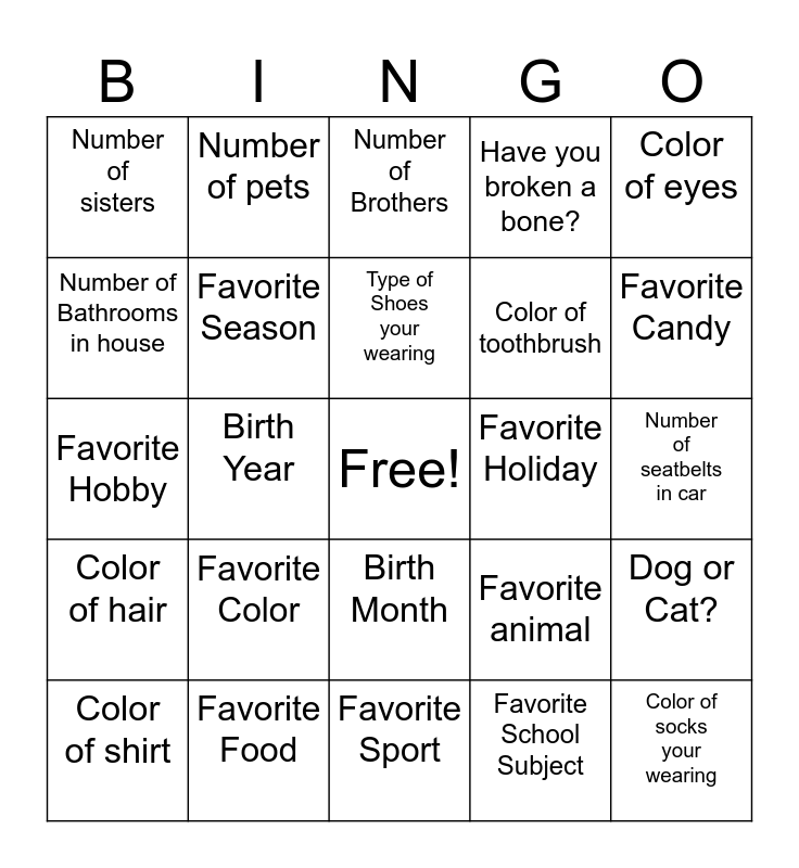 This bingo card has a free space and 24 words: Favorite Color, Favorite Food, Type of Shoes your wearing, Color of shirt, Color of eyes, Number of sisters, Number of Bathrooms in house, Number of pets, Favorite Holiday, Birth Month, Color of toothbrush, Favorite Hobby, Favorite animal, Dog or Cat?, Favorite Season, Favorite School Subject, Number of seatbelts in car, Number of Brothers, Favorite Candy, Birth Year, Color of socks your wearing, Color of hair, Have you broken a bone? and Favorite Sport.