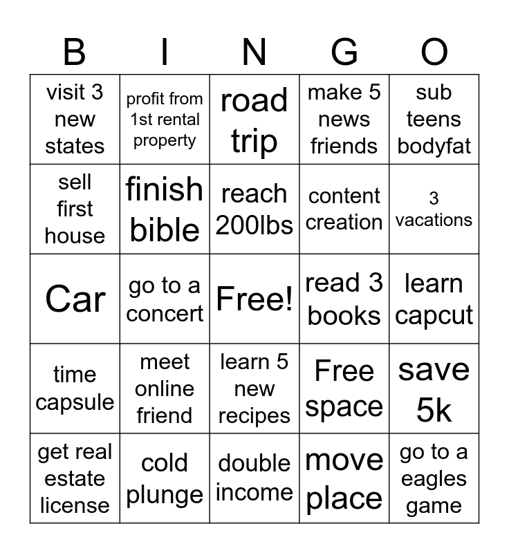 This bingo card has a free space and 25 words: meet online friend, double income, reach 200lbs, get real estate license, sub teens bodyfat, visit 3 new states, sell first house, profit from 1st rental property, read 3 books, learn 5 new recipes, content creation, Car, Free space, save 5k, finish bible, volunteer, learn capcut, road trip, 3 vacations, go to a concert, go to a eagles game, cold plunge, time capsule, make 5 news friends and move place.