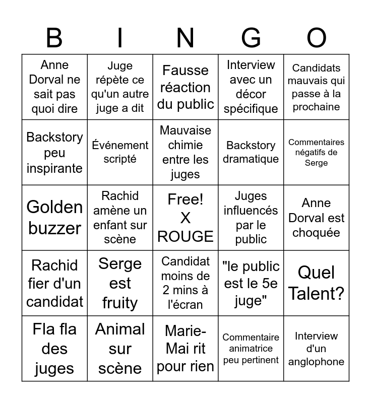 This bingo card has a free space and 33 words: "Courageux de faire ça sur scène", Commentaire bizarre, Rachid amène un enfant sur scène, Marie-Mai pleure, Rachid fier d'un candidat, Événement scripté, Candidats mauvais qui passe à la prochaine, Fla fla des juges, Juge répète ce qu'un autre juge a dit, Un trou entre les sièges du public, Mauvaise chimie entre les juges, Fausse réaction du public, Employé du monument à la caméra, Serge sur scène, Juges influencés par le public, Commentaires négatifs de Serge, Animal sur scène, Golden buzzer, Serge est fruity, "le public est le 5e juge", Candidat moins de 2 mins à l'écran, Editing étrange, Anne Dorval ne sait pas quoi dire, Anne Dorval est choquée, Marie-Mai rit pour rien, Interview d'un anglophone, Interview avec un décor spécifique, Backstory dramatique, Backstory peu inspirante, Quel Talent?, Numéro overhyped (trop d'extraits), Commentaire animatrice peu pertinent and Ils trouvent ça plus cocasse que c'est vraiment.