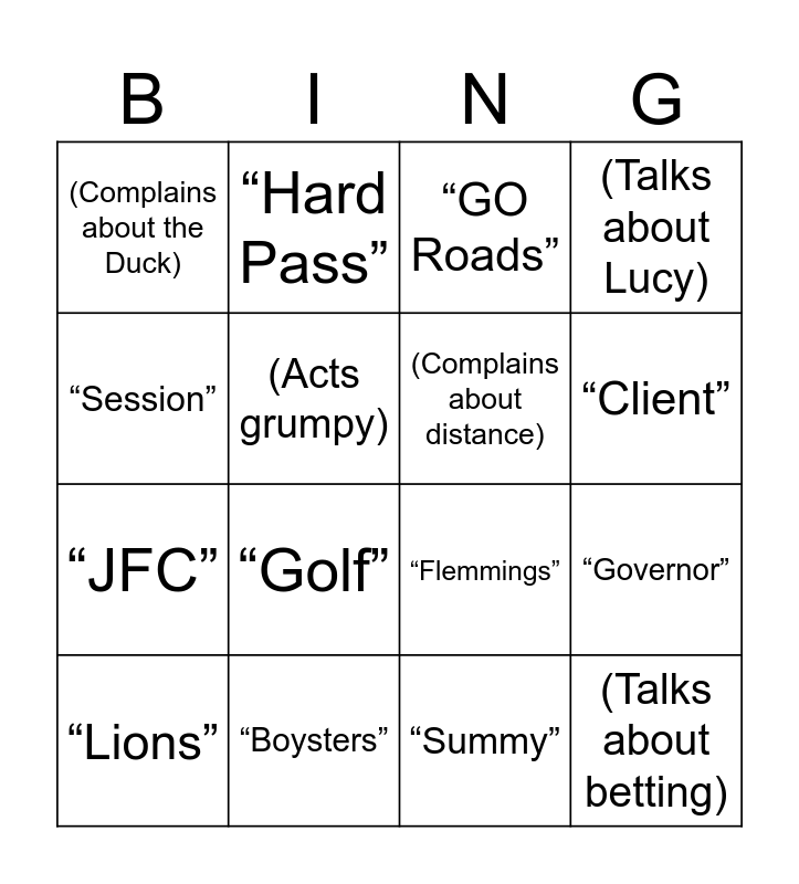 This bingo card has 20 words: “Governor”, “Zyn”, “GO Roads”, “Purdue”, “Lions”, “Session”, “Boysters”, (Complains about the Duck), “JFC”, “Hard Pass”, “Golf”, “Flemmings”, (Acts grumpy), (Talks about betting), (Complains about distance), “Mike Walz”, “Client”, (Talks about Lucy), “Summy” and “Anything Manufactured Housing related”.