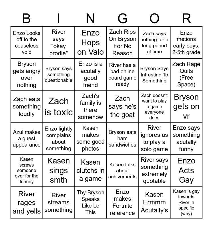 This bingo card has 40 words: Thy Bryson Speaks Like Le This, Bryson Says Intresting To Something, Bryson talks about Cheeks, Bryson gets angry over nothing, Bryson eats ham sandwiches, Bryson gets on vr, Bryson says something questionable, Bryson does a voice impression, Zach says nothing for a long period of time, Zach says he's the goat, Zach Rage Quits (Free Space), Zach Rips On Bryson For No Reason, Zach eats something loudly, Zach's family is there somehow, Zach is toxic, Zach doesn't want to play a game everyone does, Enzo Acts Gay, Enzo Looks off to the ceaseless void, Enzo makes Fortnite reference, Enzo Hops on Valo, Enzo lightly complains about something, Enzo says something acutally funny, Enzo is a acutally good friend, Enzo metions early boys, 2-5th grade, Kasen Ermmm Acutally's, Kasen talks about achivements, Kasen sings smth, Kasen is gay towards River in specific (why), Kasen screws someone over for the funnny, Kasen clutchs in a game, Kasen is largely sarcastic, Kasen makes some good photos, River rages and yells, Azul makes a guest appearance, River has a bad online board game ready, River ignores us to play a solo game, River says something extremely quotable, River streams something, River says "okay brodie" and River breaks the fourth wall and goes into Presley's cam.