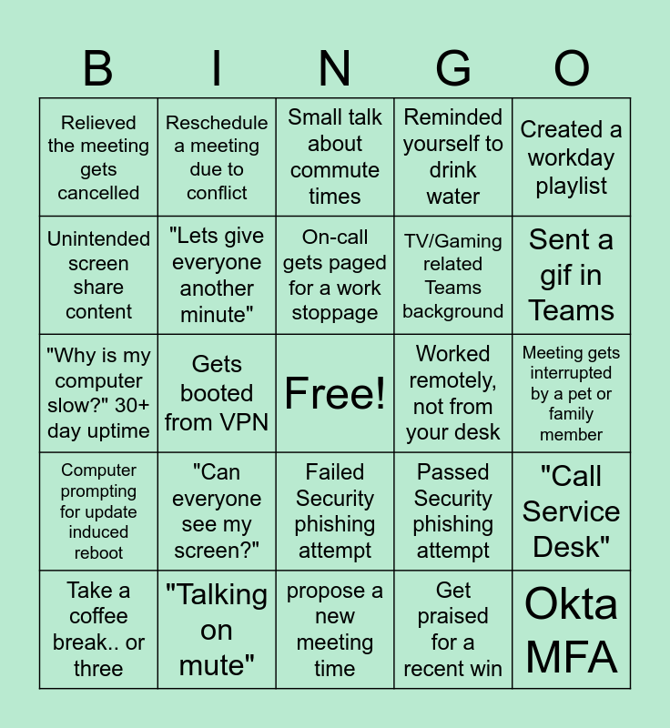 This bingo card has a free space and 29 words: Take a coffee break.. or three, Technical difficulties screen sharing, Gets booted from VPN, Did household chores during lunch, Relieved the meeting gets cancelled, Small talk about commute times, "Lets give everyone another minute", "Can everyone see my screen?", Worked remotely, not from your desk, "Talking on mute", Meeting gets interrupted by a pet or family member, Okta MFA, propose a new meeting time, Get praised for a recent win, Sent a gif in Teams, What time is my lunch today?, Failed Security phishing attempt, Computer prompting for update induced reboot, Created a workday playlist, "Why is my computer slow?" 30+ day uptime, Passed Security phishing attempt, Used an emoji in email, TV/Gaming related Teams background, Unintended screen share content, Reminded yourself to drink water, Reschedule a meeting due to conflict, "Call Service Desk", On-call gets paged for a work stoppage and Late to join CAB meeting.
