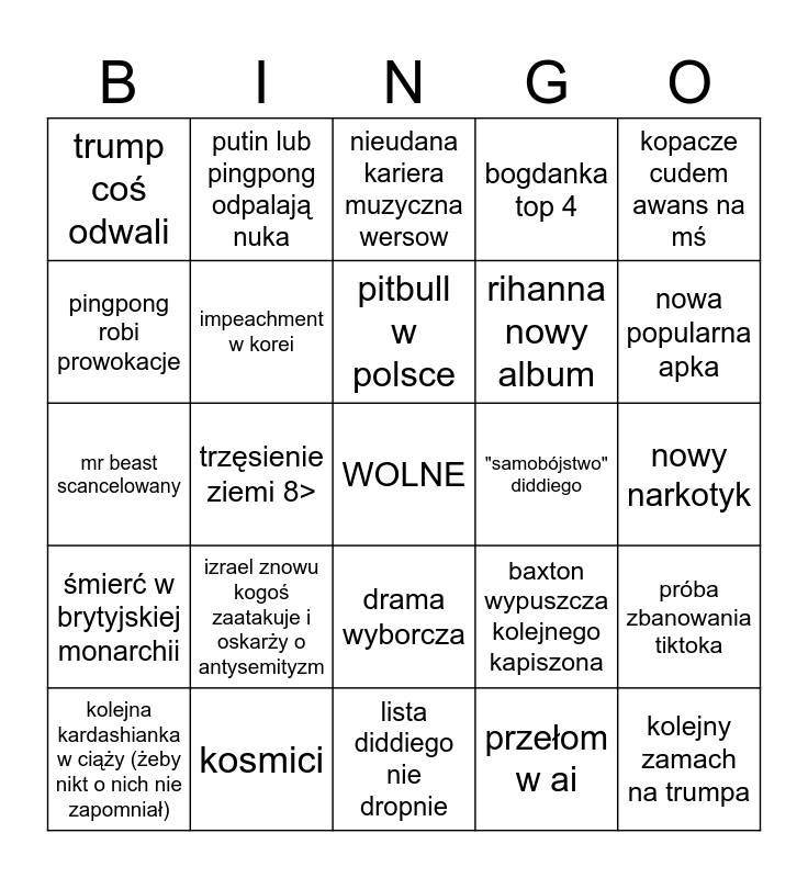 This bingo card has a free space and 24 words: izrael znowu kogoś zaatakuje i oskarży o antysemityzm, kosmici, pitbull w polsce, kolejna kardashianka w ciąży (żeby nikt o nich nie zapomniał), kopacze cudem awans na mś, trump coś odwali, pingpong robi prowokacje, putin lub pingpong odpalają nuka, "samobójstwo" diddiego, drama wyborcza, rihanna nowy album, mr beast scancelowany, baxton wypuszcza kolejnego kapiszona, próba zbanowania tiktoka, impeachment w korei, przełom w ai, nowy narkotyk, nieudana kariera muzyczna wersow, nowa popularna apka, trzęsienie ziemi 8>, kolejny zamach na trumpa, śmierć w brytyjskiej monarchii, bogdanka top 4 and lista diddiego nie dropnie.