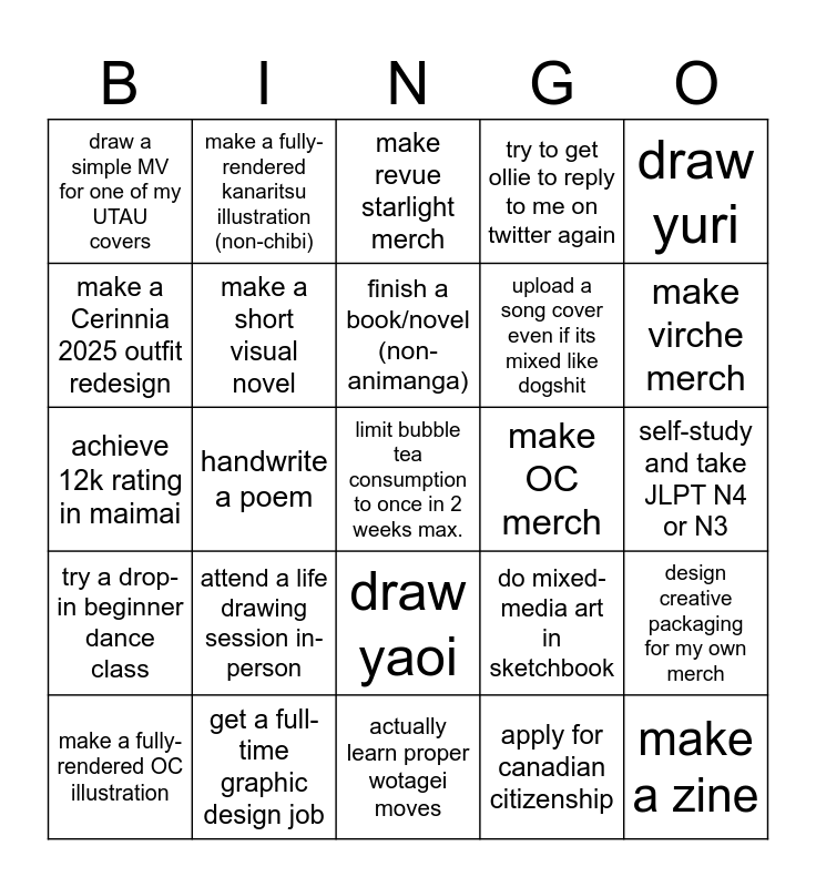 This bingo card has a free space and 24 words: attend a life drawing session in-person, get a full-time graphic design job, finish a book/novel (non-animanga), make a fully-rendered OC illustration, draw yuri, draw a simple MV for one of my UTAU covers, make a Cerinnia 2025 outfit redesign, make a fully-rendered kanaritsu illustration (non-chibi), make OC merch, draw yaoi, upload a song cover even if its mixed like dogshit, achieve 12k rating in maimai, do mixed-media art in sketchbook, design creative packaging for my own merch, make a short visual novel, apply for canadian citizenship, self-study and take JLPT N4 or N3, make revue starlight merch, make virche merch, handwrite a poem, make a zine, try a drop-in beginner dance class, try to get ollie to reply to me on twitter again and actually learn proper wotagei moves.