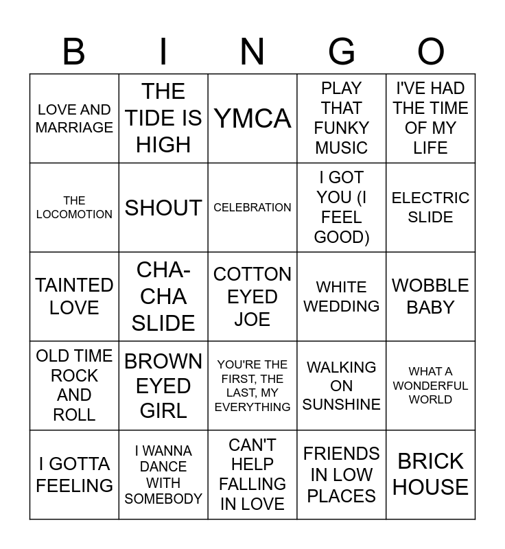 This bingo card has 25 words: BROWN EYED GIRL, CAN'T HELP FALLING IN LOVE, CELEBRATION, I GOTTA FEELING, I'VE HAD THE TIME OF MY LIFE, LOVE AND MARRIAGE, THE LOCOMOTION, THE TIDE IS HIGH, WHITE WEDDING, YOU'RE THE FIRST, THE LAST, MY EVERYTHING, I GOT YOU (I FEEL GOOD), TAINTED LOVE, WALKING ON SUNSHINE, WHAT A WONDERFUL WORLD, SHOUT, BRICK HOUSE, WOBBLE BABY, YMCA, ELECTRIC SLIDE, CHA-CHA SLIDE, COTTON EYED JOE, I WANNA DANCE WITH SOMEBODY, OLD TIME ROCK AND ROLL, PLAY THAT FUNKY MUSIC and FRIENDS IN LOW PLACES.