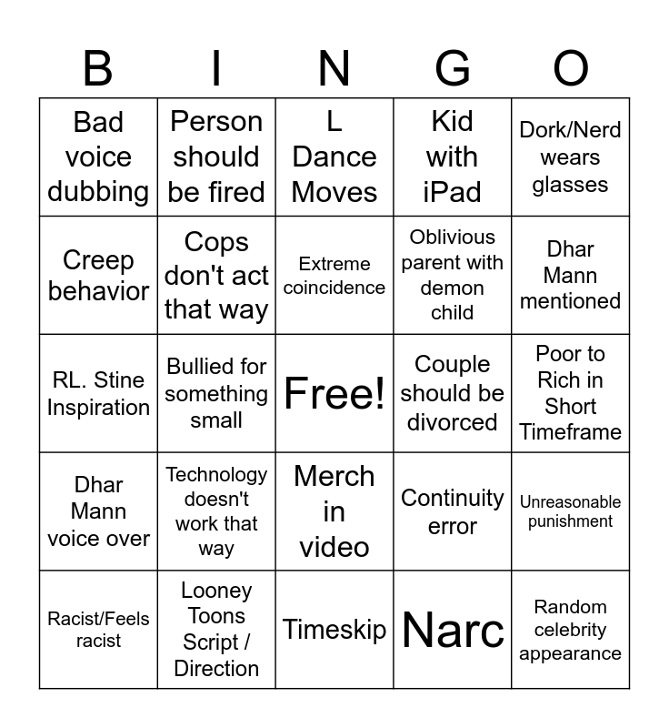This bingo card has a free space and 48 words: Bad homemade prop, Random celebrity appearance, Cartoon super villain, Timeskip, Technology doesn't work that way, Clearly in the wrong person has attitude, Person should be fired, Heavy topic written lightly, Creep behavior, Quick unjustified anger, Cops don't act that way, Kid with iPad, Unreasonable punishment, Continuity error, Parking lot confrontation, Spaghetti, Extreme coincidence, Couple should be divorced, Age old saying, Dork/Nerd wears glasses, Bullied for something small, Narc, Bad voice dubbing, Oblivious parent with demon child, PS5, Dhar Mann mentioned, Racist/Feels racist, Problematic lesson, Merch in video, Dhar Mann voice over, Random thoughts out loud, Roblox, Fortnite, or Minecraft, Unreasonable and chill parent duo, Montage with Music, Looney Toons Script / Direction, Cartoon Character Design, Unsupportive Parent, Poor to Rich in Short Timeframe, Can’t afford rent, L Rizz, Miah In Video, Saying what we can already see, L Dance Moves, Basic Goody Two Shoes, RL. Stine Inspiration, Kid clearly doesn’t go to this school, Hip Lingo and Out of touch parents.
