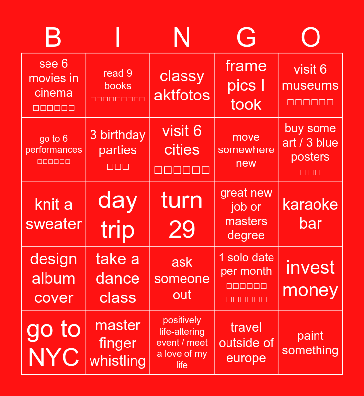 This bingo card has a free space and 24 words: take a dance class, master finger whistling, visit 6 cities □□□□□□, go to NYC, visit 6 museums □□□□□□, see 6 movies in cinema □□□□□□, go to 6 performances □□□□□□, read 9 books □□□□□□□□□, great new job or masters degree, ask someone out, move somewhere new, knit a sweater, 1 solo date per month □□□□□□ □□□□□□, invest money, 3 birthday parties □□□, travel outside of europe, karaoke bar, classy aktfotos, buy some art / 3 blue posters □□□, day trip, paint something, design album cover, frame pics I took and positively life-altering event / meet a love of my life.