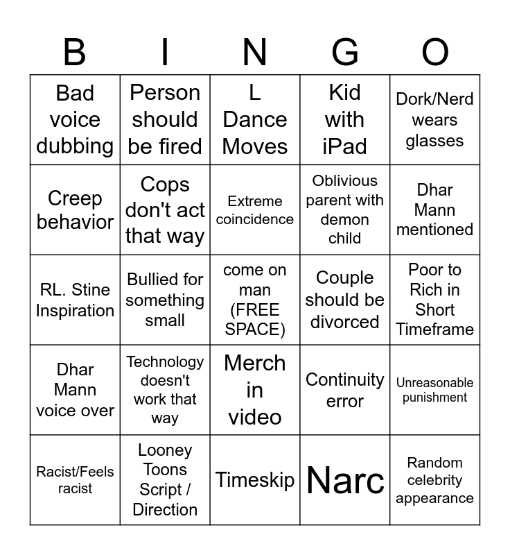 This bingo card has a free space and 48 words: Bad homemade prop, Random celebrity appearance, Cartoon super villain, Timeskip, Technology doesn't work that way, Clearly in the wrong person has attitude, Person should be fired, Heavy topic written lightly, Creep behavior, Quick unjustified anger, Cops don't act that way, Kid with iPad, Unreasonable punishment, Continuity error, Parking lot confrontation, Spaghetti, Extreme coincidence, Couple should be divorced, Age old saying, Dork/Nerd wears glasses, Bullied for something small, Narc, Bad voice dubbing, Oblivious parent with demon child, PS5, Dhar Mann mentioned, Racist/Feels racist, Problematic lesson, Merch in video, Dhar Mann voice over, Random thoughts out loud, Roblox, Fortnite, or Minecraft, Unreasonable and chill parent duo, Montage with Music, Looney Toons Script / Direction, Cartoon Character Design, Unsupportive Parent, Poor to Rich in Short Timeframe, Can’t afford rent, L Rizz, Miah In Video, Saying what we can already see, L Dance Moves, Basic Goody Two Shoes, RL. Stine Inspiration, Kid clearly doesn’t go to this school, Hip Lingo and Out of touch adult.