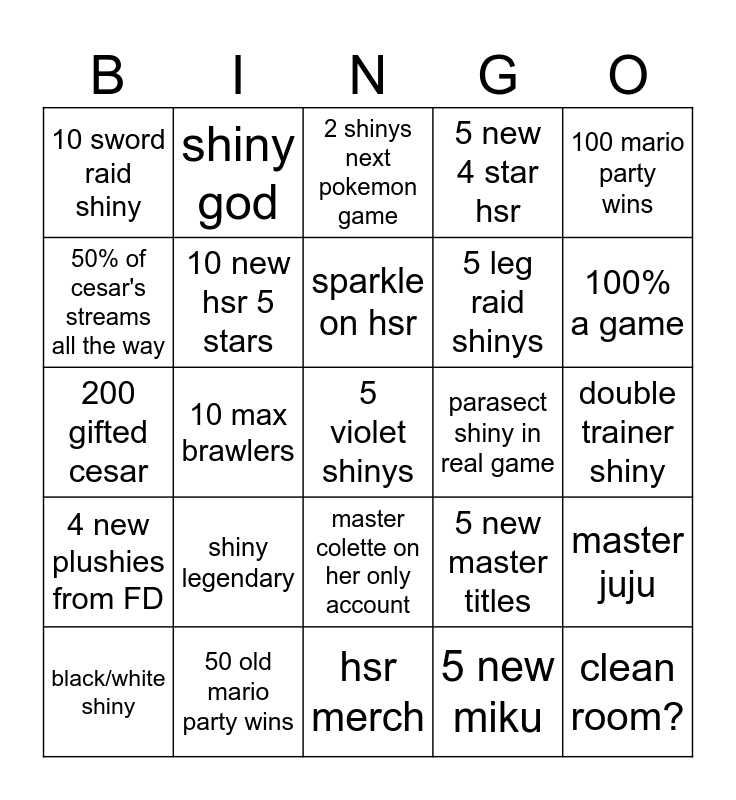 This bingo card has a free space and 24 words: black/white shiny, shiny legendary, sparkle on hsr, 5 new miku, 100 mario party wins, 10 sword raid shiny, shiny god, 2 shinys next pokemon game, parasect shiny in real game, double trainer shiny, 200 gifted cesar, 10 new hsr 5 stars, 5 new master titles, master juju, 50% of cesar's streams all the way, 50 old mario party wins, hsr merch, 5 new 4 star hsr, 100% a game, 4 new plushies from FD, 10 max brawlers, master colette on her only account, 5 leg raid shinys and clean room?.