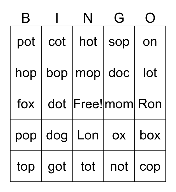 This bingo card has a free space and 24 words: dog, got, mop, top, on, pot, hop, cot, mom, Lon, doc, fox, ox, box, bop, not, Ron, hot, lot, dot, cop, pop, sop and tot.
